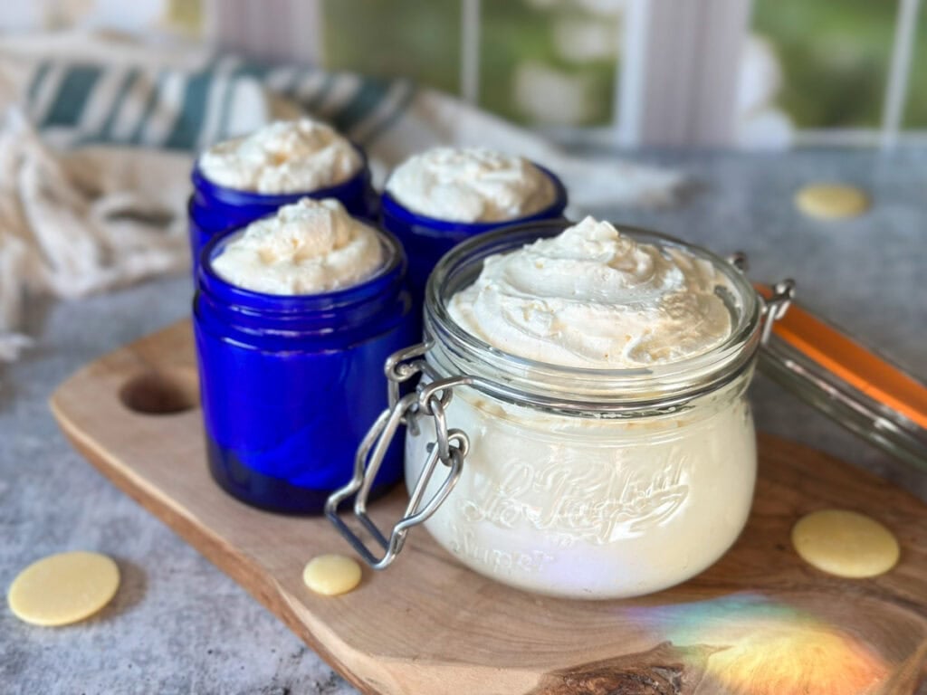 Give the gift of soft, smooth, glowing skin with our DIY whipped body butter recipe. It’s easy to make with just 4 all-natural ingredients: shea butter, cocoa butter, coconut oil, and your choice of liquid oil such as jojoba oil, sweet almond oil, or olive oil. This fluffy, creamy, homemade body butter melts right into your skin with a non-greasy finish – and can be packaged into jars with a cute gift tag and ribbon!