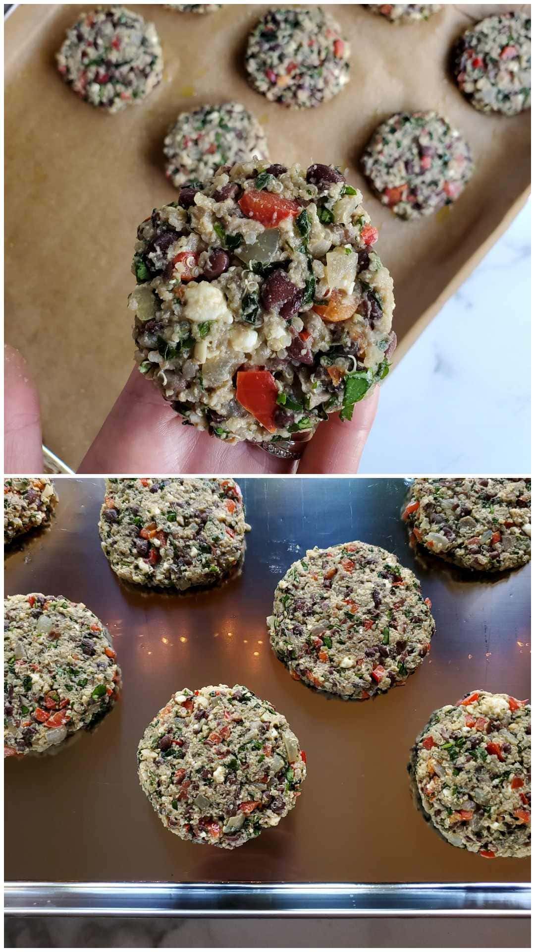 - Use your hands to gather and form the veggie burger mix into patty sizes of your liking. We usually make them on the small side – forming appropriately 3″ round by ½” thick mini veggie burgers. Feel free to make larger burgers, but be more gentle when flipping them.