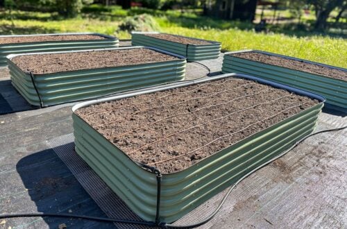- Water: Consistent moisture is key to growing nice beets! Try to keep the soil evenly moist at all times (but not soggy). Beets will fail to thrive and will get tough and “hairy” without enough water, so try not to let the soil dry out between watering. We have automated drip in irrigation for our raised garden beds – it’s a lifesaver!