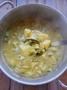- Next, pour in the vegetable broth, water, coconut cream (or crème fraîche) and optional nutritional yeast. Bring the soup to a boil and then reduce to a simmer. Continue to simmer until the potatoes are very soft and falling apart, about 15 to 25 minutes (depending on potato variety and size). If you don’t plan to blend the soup, cook until the potatoes are fork-tender but not falling apart.