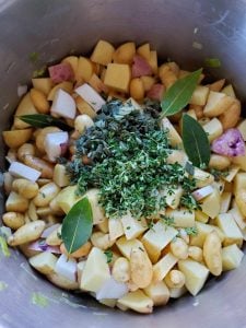 - Once the leeks, onions, and garlic have softened, add the potatoes, fresh chopped herbs, whole bay leaves, salt and black pepper to the pot. Stir to combine.