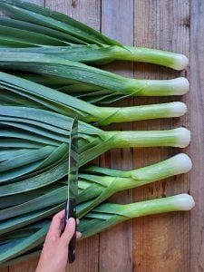 - Next, slice the leeks into thin rounds.