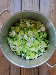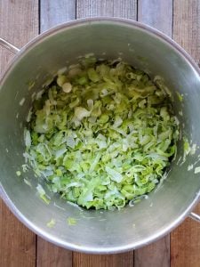 - Heat a large stock pot on the stovetop with 3 tablespoons of olive oil (or butter). Then add the sliced leeks and chopped onion, celery, and diced garlic.