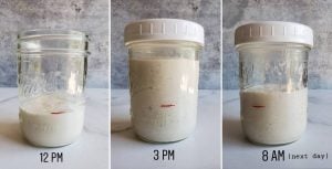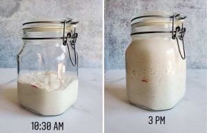 - Cover the container, note the level of the starter on the side of the container, and set it aside again. If you’re using a pint jar, it should be about ⅓ full now.