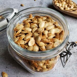Once the pumpkin seeds have fully cooled, transfer them to an airtight container with a lid for storage like this glass flip-top jar. Store them in a cool dark location, such as the pantry or kitchen cupboard.