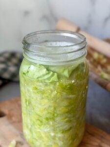 - To help prevent any floaties, place one or two whole reserved cabbage leaves in the jar on top of the shredded cabbage.