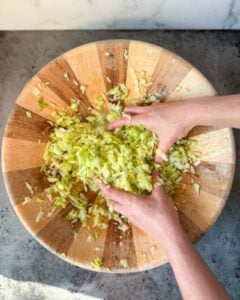 - Alternatively (if you don’t want to massage by hand) you can salt the cabbage and let it sit for at least 30 minutes draw out moisture, then use a pounder/tamper to crush it further.