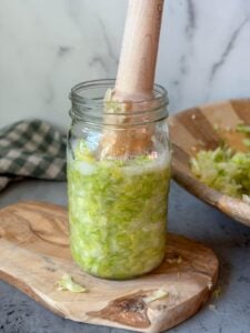 - Transfer all of the shredded cabbage (and its juices) into a clean jar, stopping several times as you go to tightly pack and press the cabbage down into the jar with a kraut pounder, tamper, the back of a large spoon, or similar tool. This helps to fit as much in the jar as possible, as well as release more juices and remove trapped air bubbles – which is important to prevent mold!