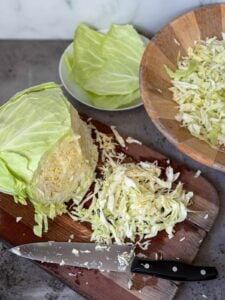 - Cut the cabbage in half (or quarters), remove the tough center core, then thinly slice the cabbage into fine shreds or 1/8-inch thick “ribbons” by hand or with a mandolin slicer (not a food processor)