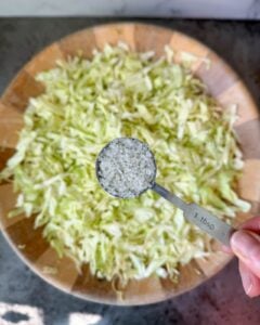 - Next, sprinkle 1 Tbsp + 1 tsp of sea salt over the 2 pounds of cabbage (or 2 tsp per 1 pound). Toss and mix well to combine.
