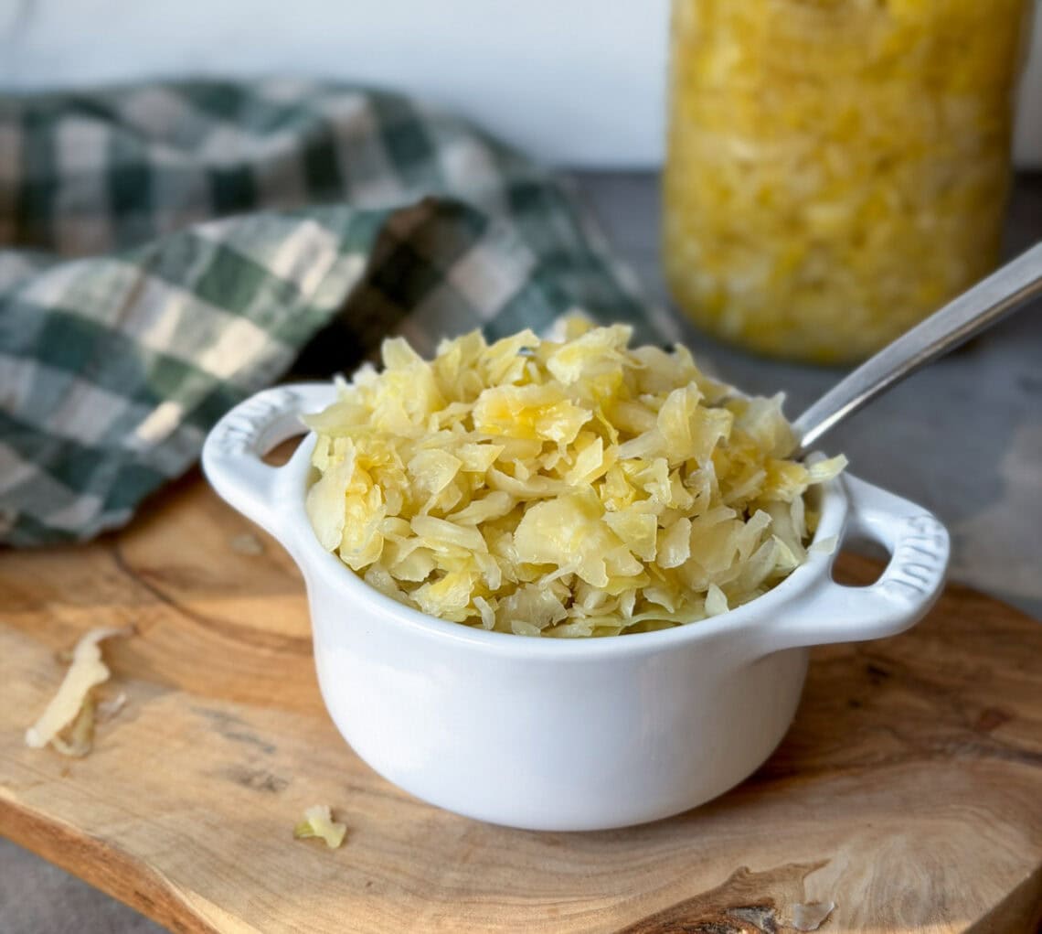 Come learn how to make homemade sauerkraut with our easy step-by-step recipe. It’s tangy, delicious, and full of gut-healthy probiotics! This simple method is perfect for beginners and only requires two ingredients: cabbage and salt. The result is a classic sauerkraut that compliments a wide variety of meals.