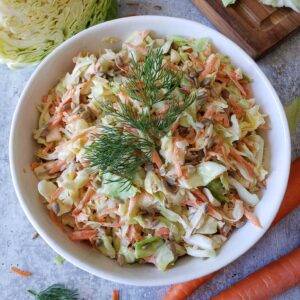 - Size: This recipe makes a fairly hefty bowl of coleslaw – perfect for a small gathering, an average to large-size family, or like us – enough leftovers for two to enjoy for several days! So, feel free to scale up or down as needed.